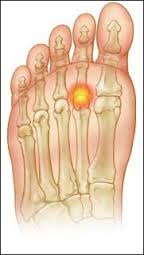 5. Βλαισός μέγας Δάκτυλος (κότσι): Η κληρονομικότητα και το στενό, μυτερό και ψηλό παπούτσι είναι δυο από τους κυριότερους αιτιολογικούς παράγοντες για την εμφάνιση μεταταρσαλγίας. Αυτό συμβαίνει γιατί η παραμόρφωση του μεγάλου δάκτυλου ασκεί πίεση στο δεύτερο δάχτυλο, το οποίο με τη σειρά του ανασηκώνεται και μετατοπίζεται, και τελικά τραυματίζεται ο αρθρικός θύλακας της άρθρωσης (εικόνα 5).