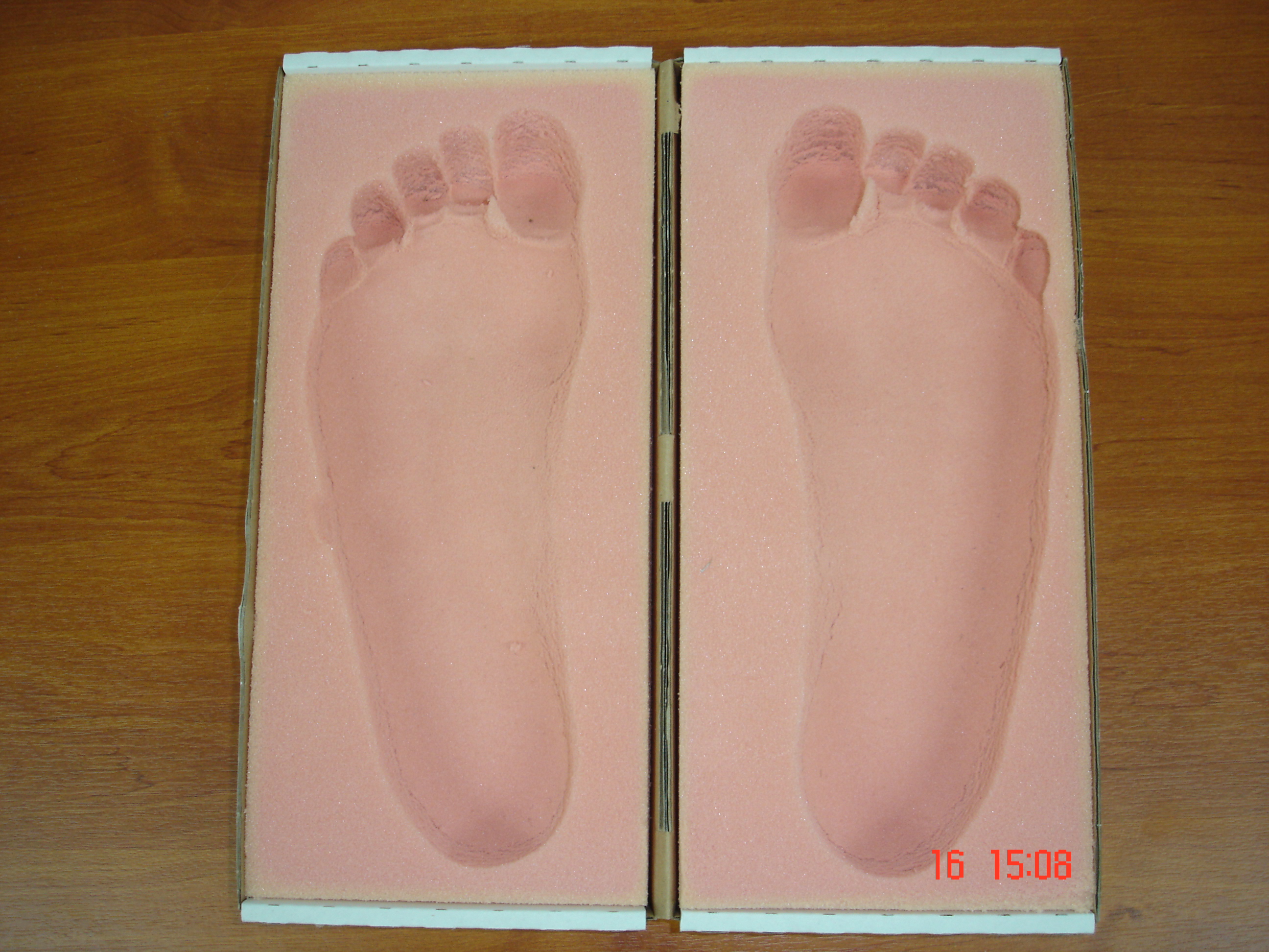 Θεραπεία: Στην οξεία φάση του προβλήματος όπου ο πόνος είναι παρά πολύ έντονος, ενδείκνυται ξεκούραση, εφαρμογή πάγου και η χρήση αναλγητικών φαρμάκων κατόπιν ιατρικής παρακολούθησης. Στη συνέχεια ο Ποδίατρος εκτελεί στατική και δυναμική ανάλυση βάδισης (εικόνα 6 & 7) με τη βοήθεια του πελματογράφου και τη λήψη προπλάσματος (εικόνα 8) για την κατασκευή ζεύγους ειδικών εξατομικευμένων ορθωτικών πελμάτων. Εικόνα 6. Στατικό Εικόνα 7 Δυναμικό Εικόνα 8. Πρόπλασμα