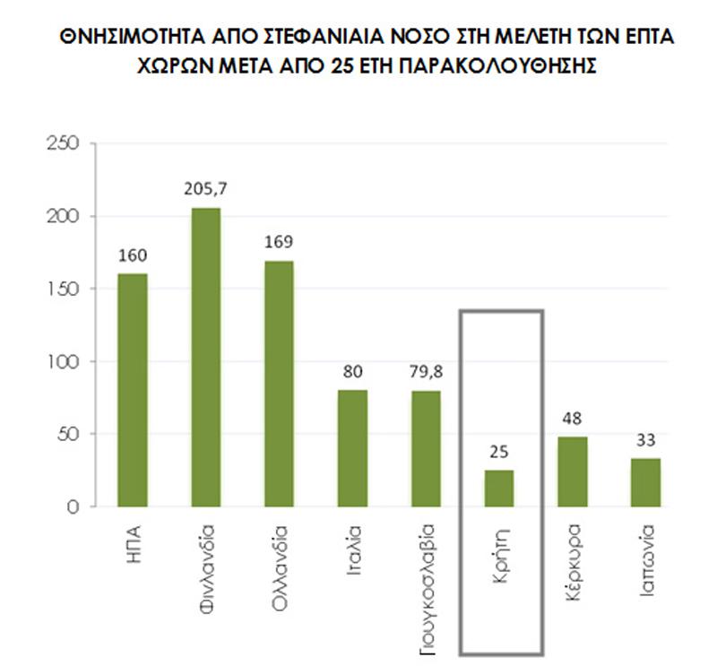 Διάγραμμα 1. Η θνησιμότητα από στεφανιαία νόσο ανά 1000 άτομα στους πληθυσμούς που μελετήθηκαν στη Μελέτη των Επτά Χωρών, μετά από τα 25 έτη παρακολούθησης. Δίνεται ο μέσος όρος της θνησιμότητας για δύο πληθυσμούς που μελετήθηκαν από τη Φινλανδία, για τρεις πληθυσμούς που μελετήθηκαν από την Ιταλία, για 5 πληθυσμούς που μελετήθηκαν από τη Γιουγκοσλαβία και για 2 πληθυσμούς που μελετήθηκαν από την Ιαπωνία. Στις Ηνωμένες Πολιτείες, όπως και στην Ολλανδία, μελετήθηκε ένας πληθυσμός. Κανένας από τους επιμέρους πληθυσμούς δεν παρουσίαζε θνησιμότητα μικρότερη από την Κρήτη (symfono_gram, www.cretan-nutrition.gr 2009).